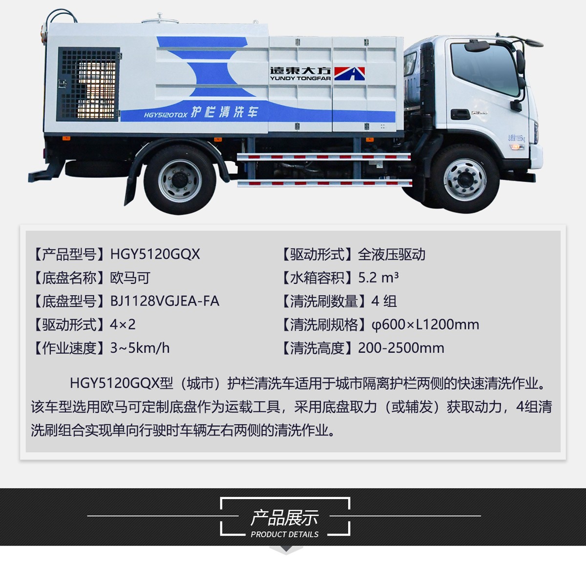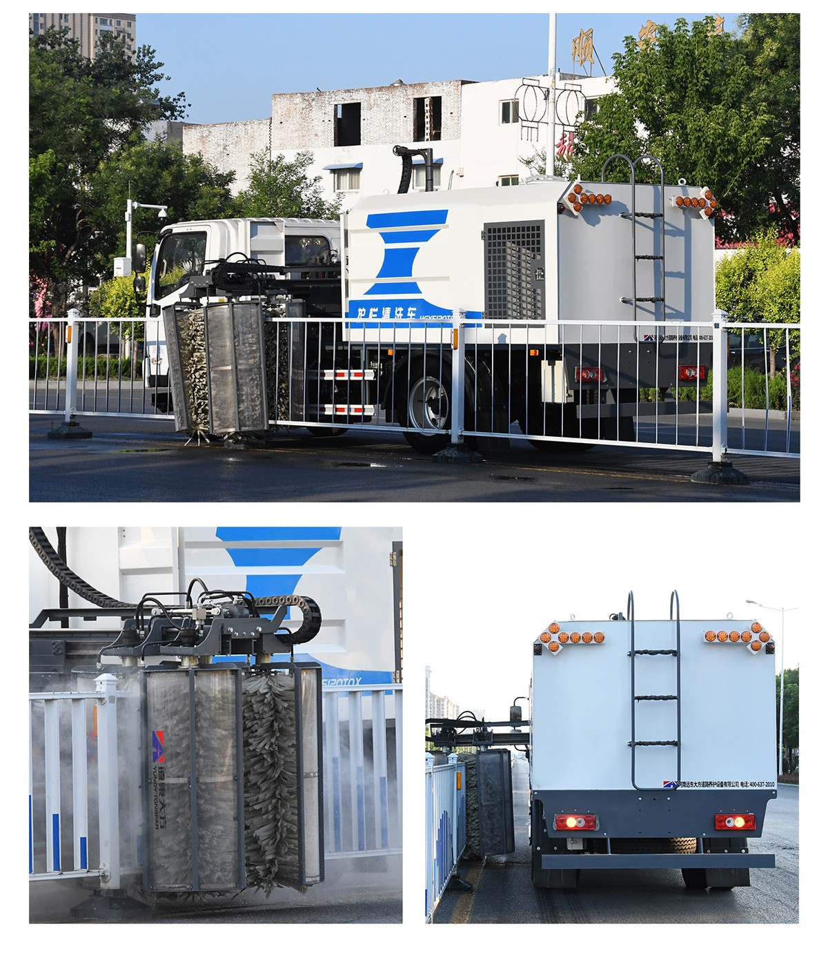 HGY5120GQX型(城市)護欄清洗車適用于城市隔離護欄兩側的快速清洗作業(yè)。該車型選用歐馬可定制底盤,全液壓驅動,多組清洗刷組合實現(xiàn)單向行駛時車輛左右兩側的清洗作業(yè)。